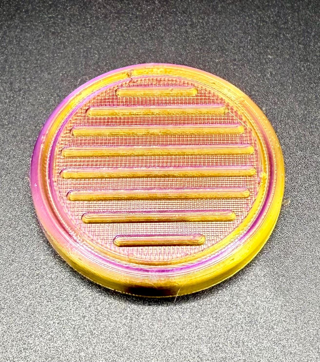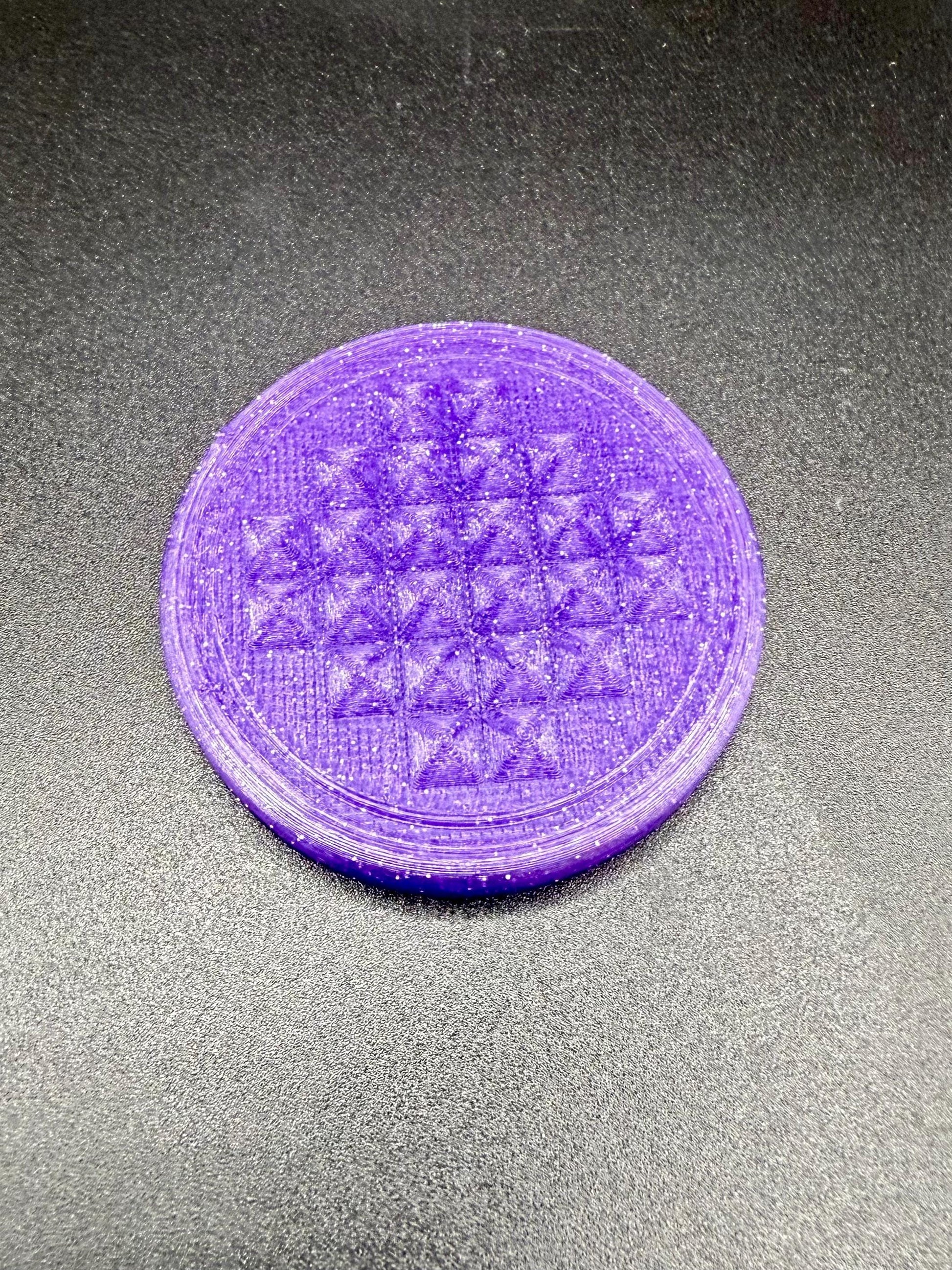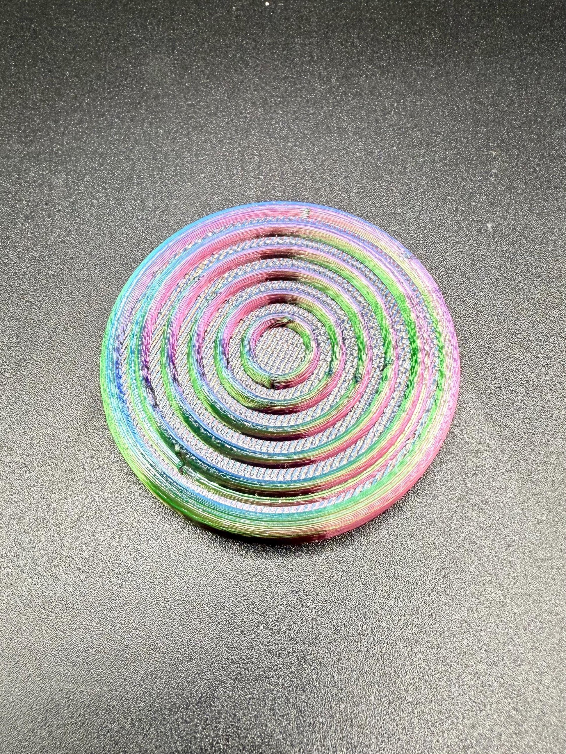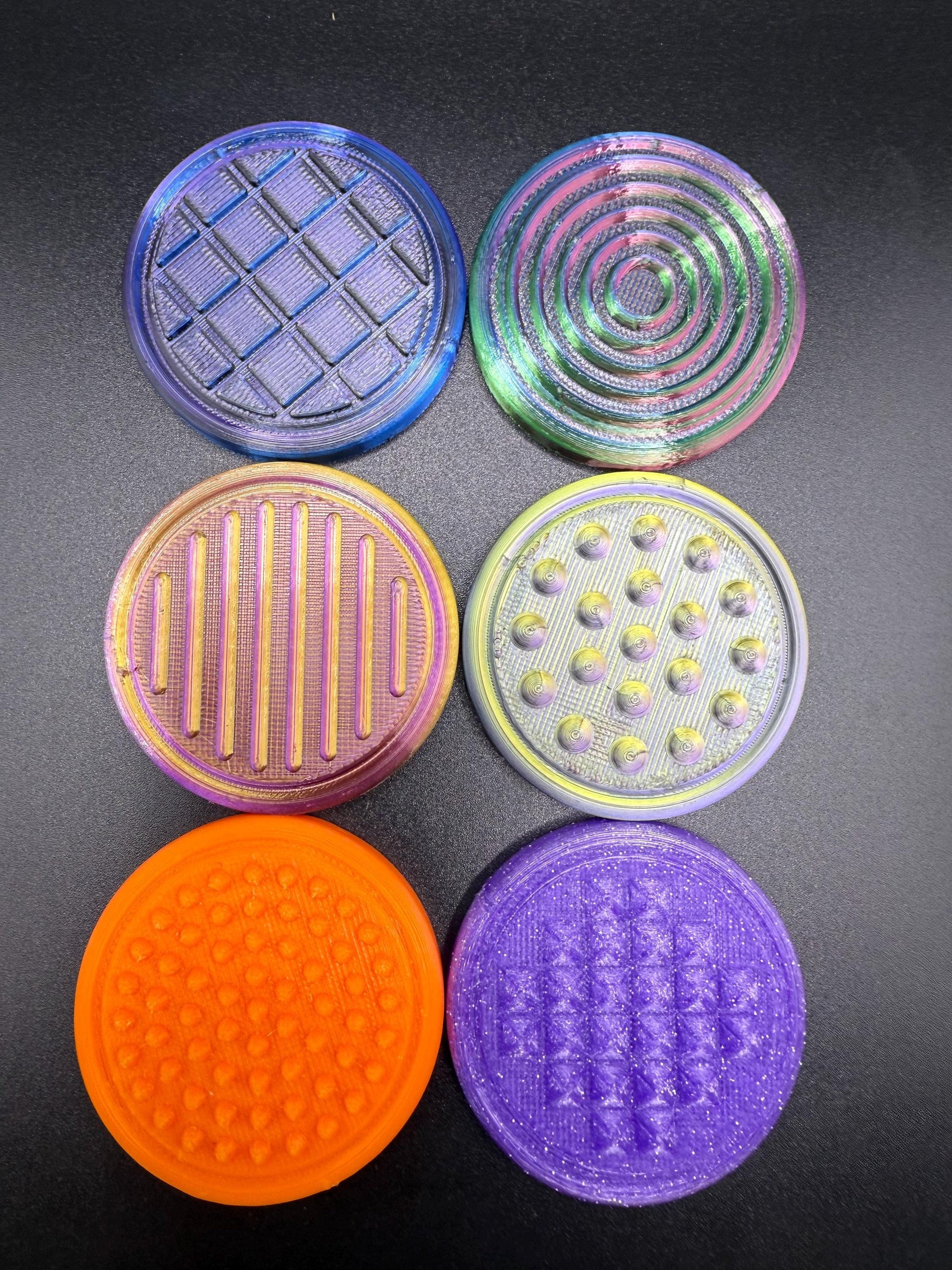 A collection of 6 3D printed pucks, each topped with a distinct surface pattern. Perfect for stacking, displaying, or enjoying their unique textures.